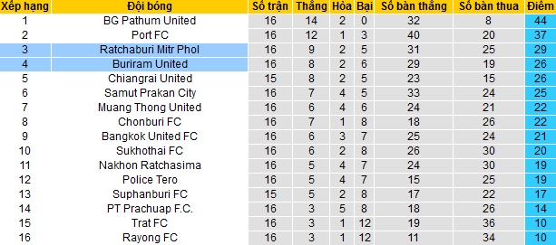 Bảng xếp hạng giải VĐQG Thái Lan trước vòng 17