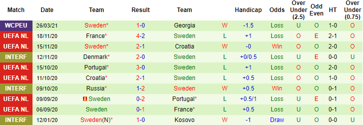 + Thống kê 10 trận gần nhất của Thụy Điển