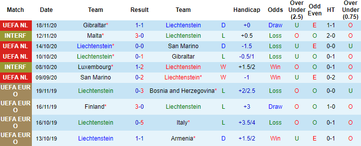 + Thống kê 10 trận gần nhất của Liechtenstein