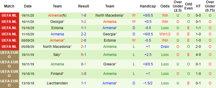 + Thống kê 10 trận gần nhất của Armenia