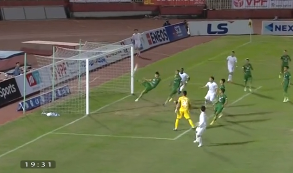 Phút 33: Hai cú tạt bóng liên tiếp bên cánh phải của Vũ Văn Thanh, thủ môn Sài Gòn FC phải vất vả bay người đấm bóng ở quả tạt thứ 2.